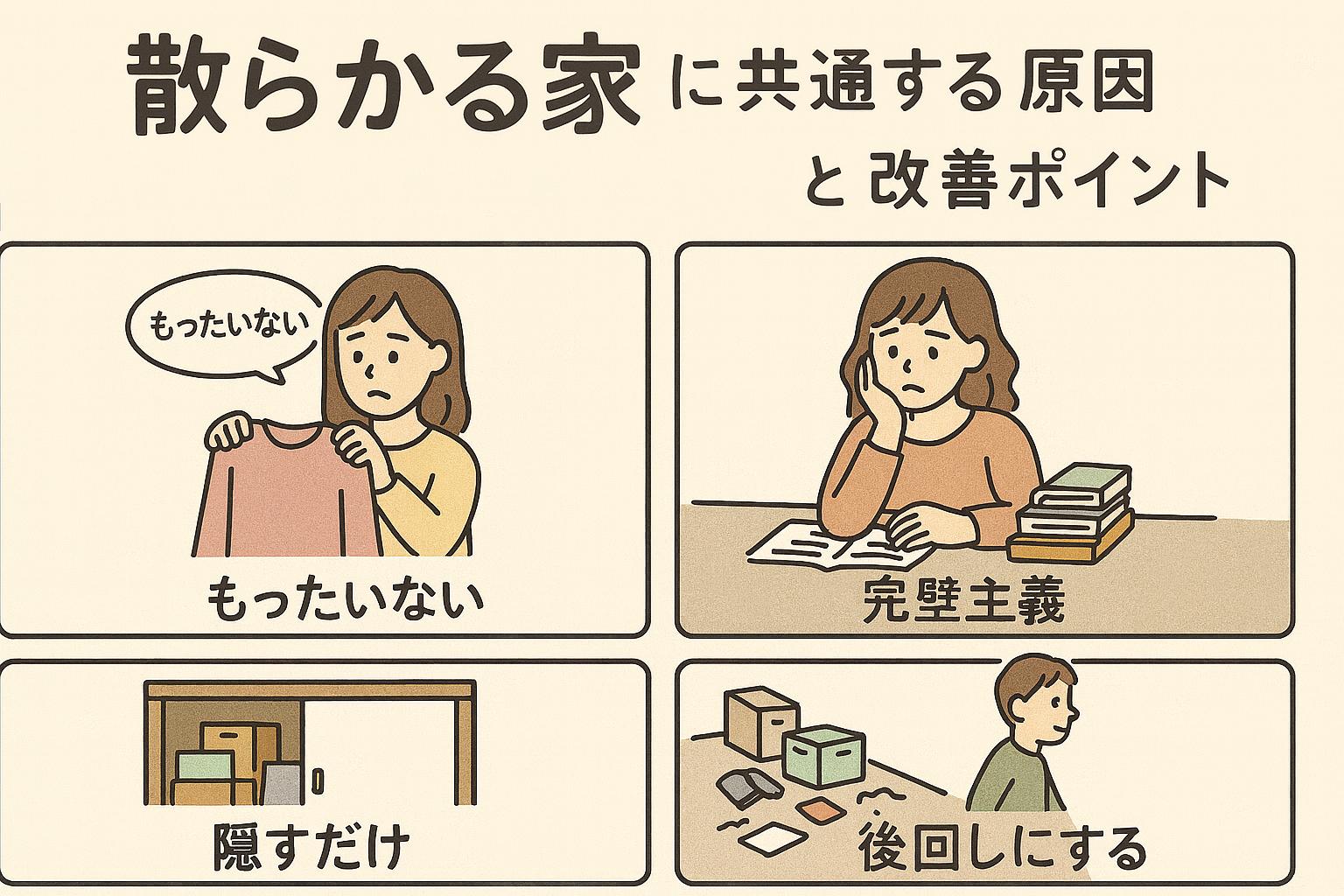 この記事では、片付かない原因をタイプ別にわかりやすく解説しながら、今日からすぐできる改善ポイントもご紹介します。片付けが苦手な方、忙しくて手が回らない方も必見です!